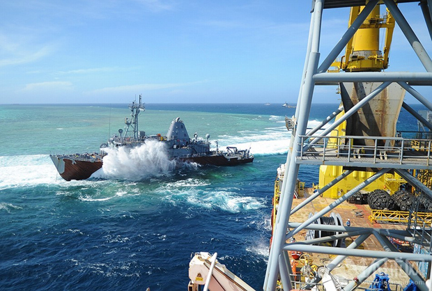 2月24日,一艘美国海军的舰船停靠在“护卫者”号扫雷舰旁边协助转移物资并准备开展对该舰的拆卸工作。